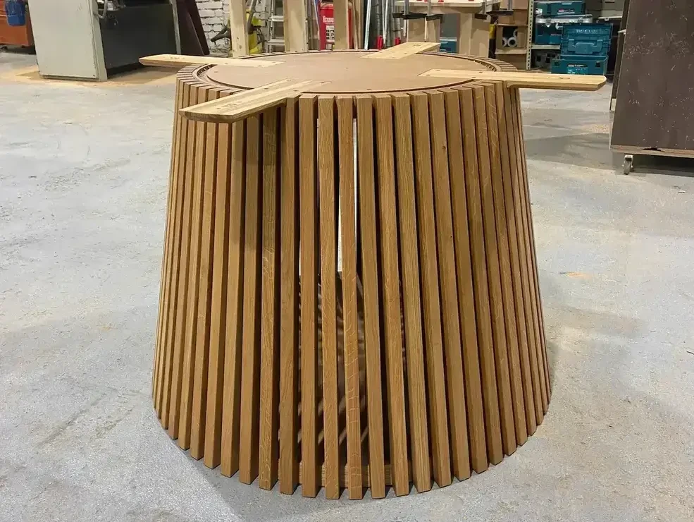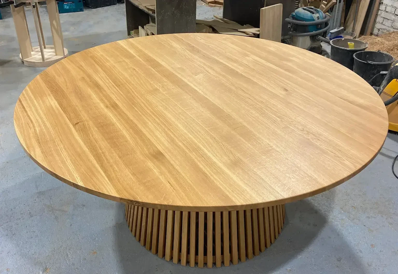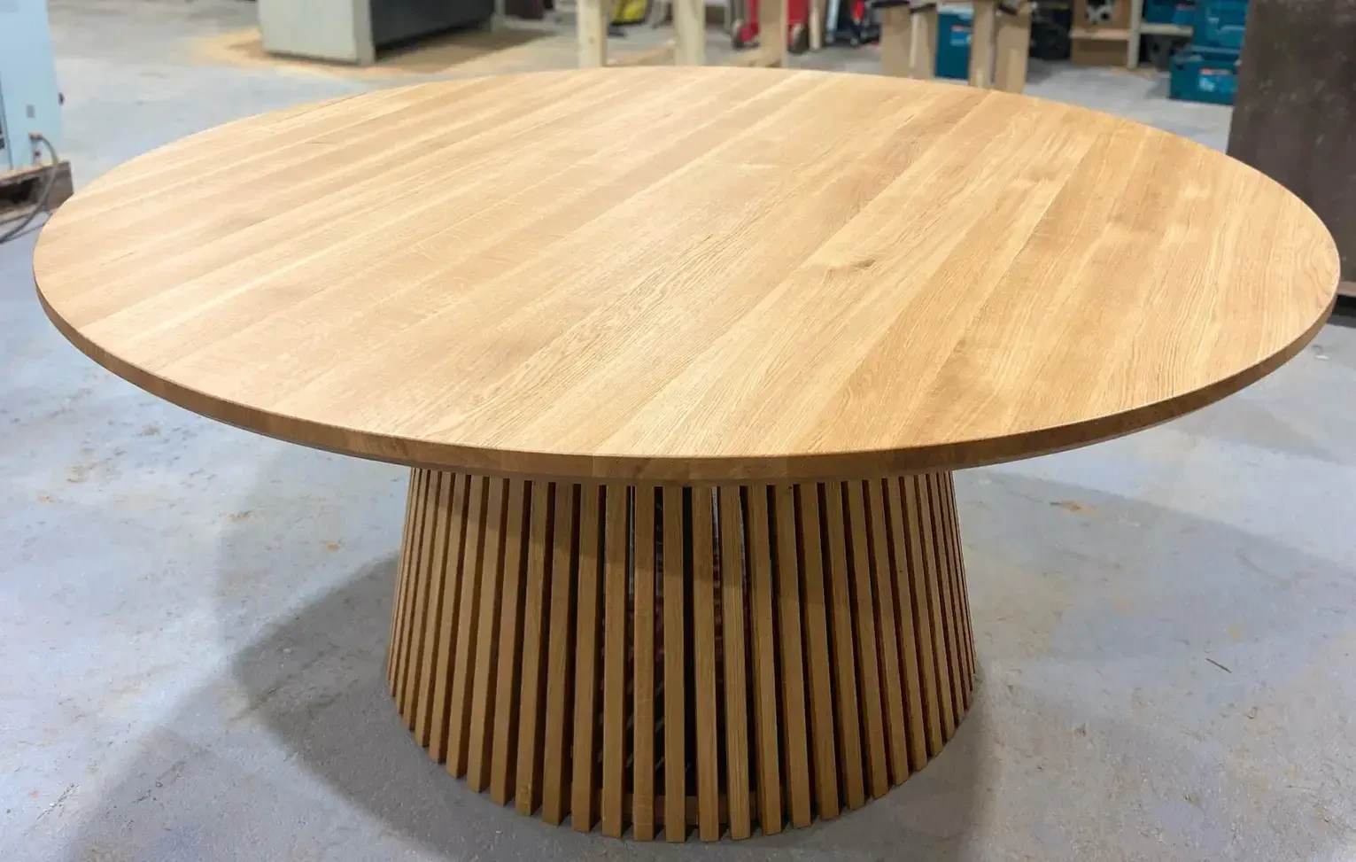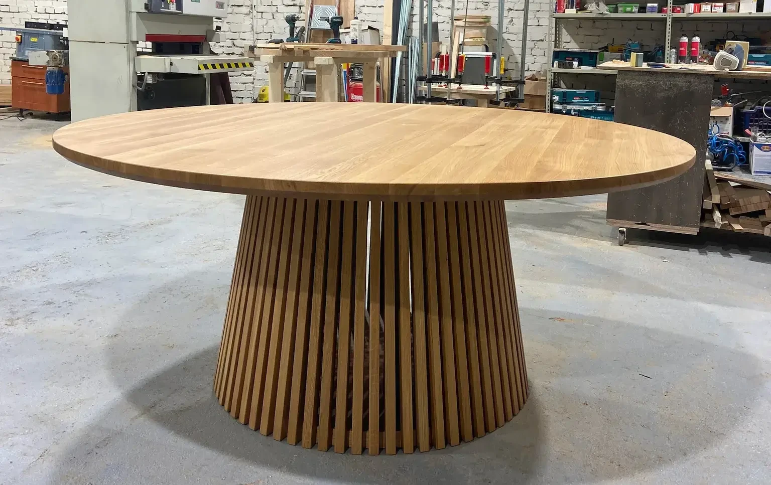 40 mm thick tabletop with a 45-degree cut, specific trapezoid-shaped leg made of oak bars. The tabletop is made of a wide-lamella edge glued panel. Coated with natural oil.