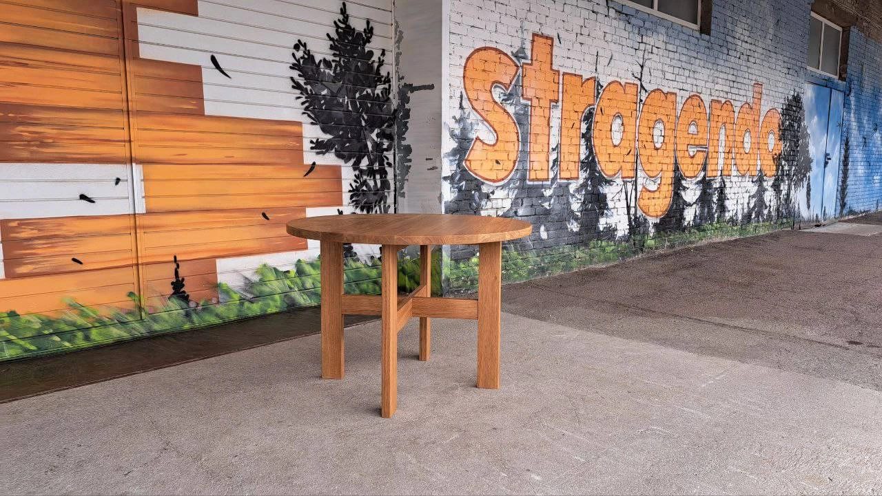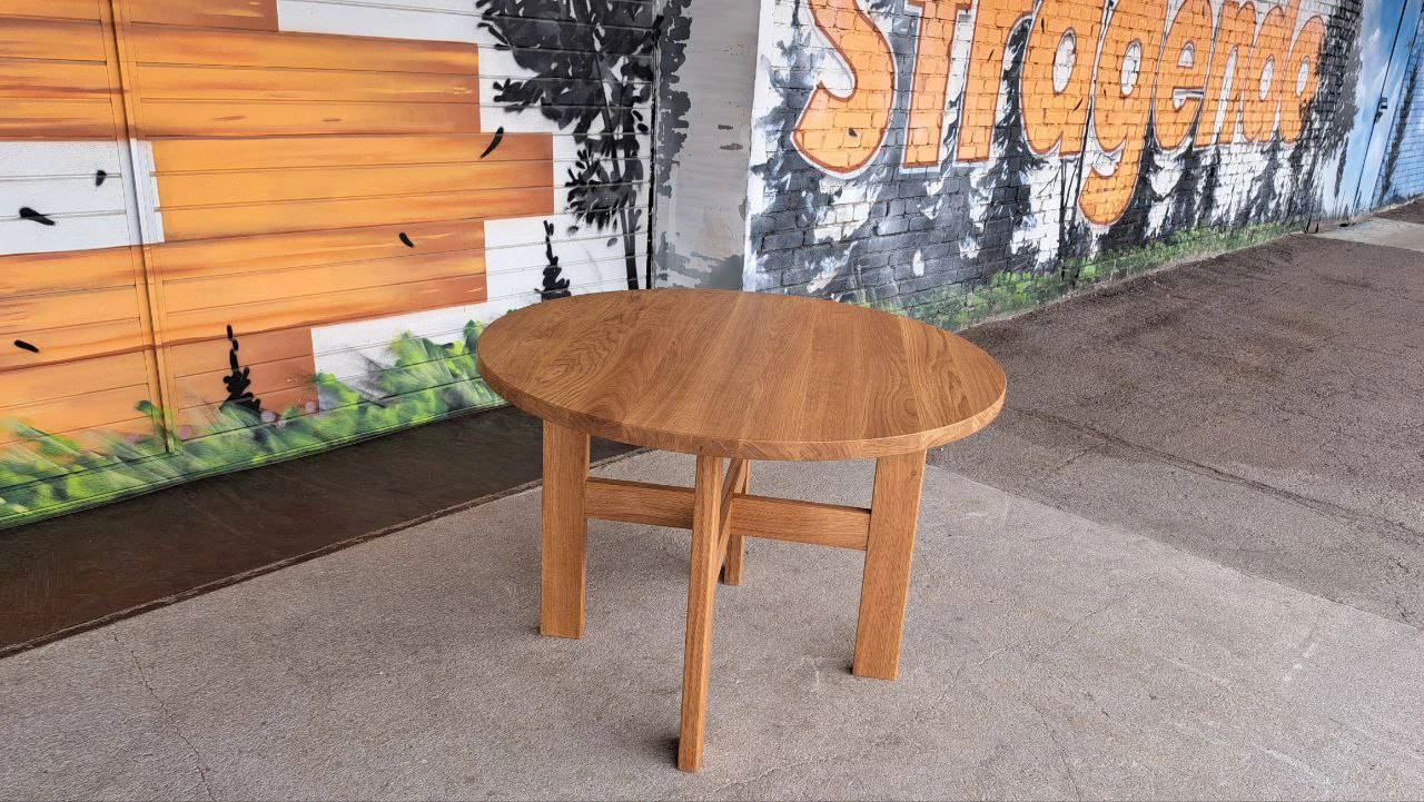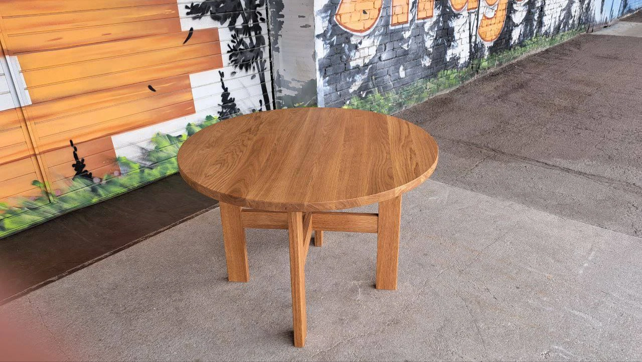 Apaļš galds no ozolkoka dēļiem, diametrs 1,1 m.