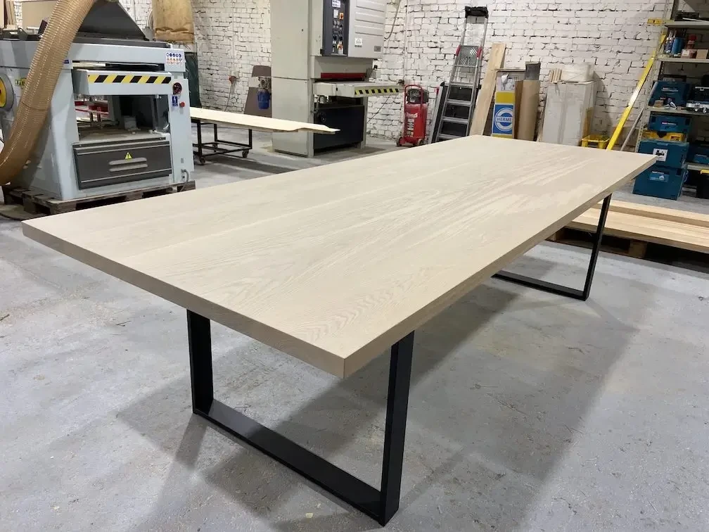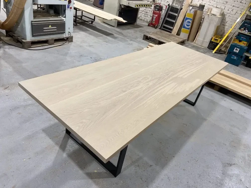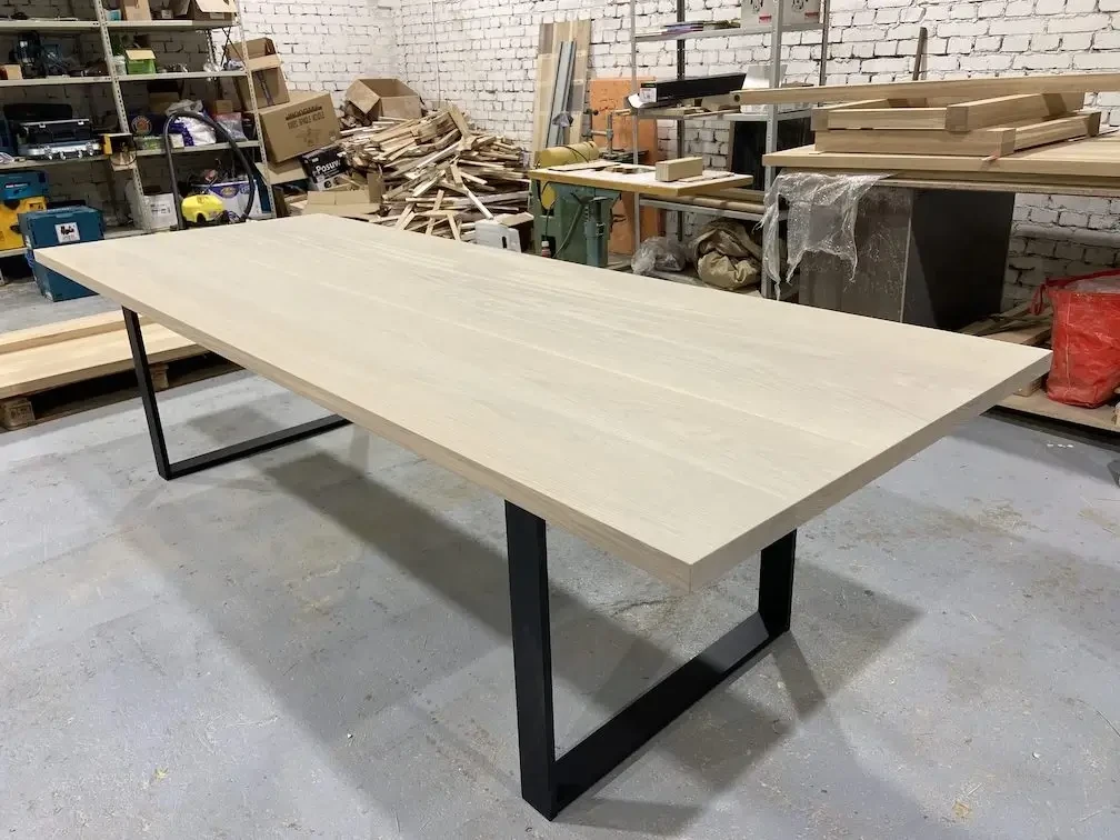 Galda virsma 1000 x 2500 mm. Izgatavota no 200 mm platiem dēļiem, izmantojot īpašu tehnoloģiju. Apstrāde ar balinātu Osmo eļļu.