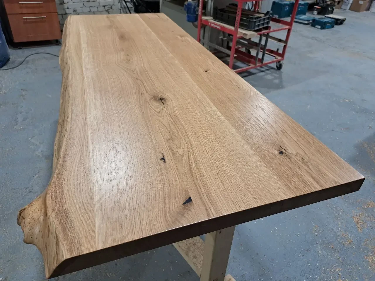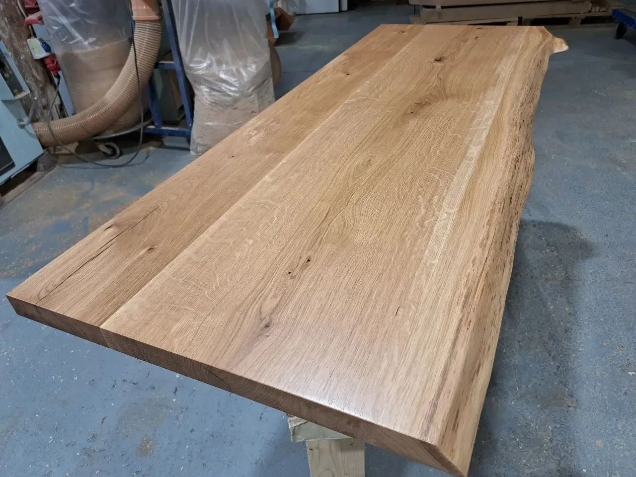 Lauaplaat tammepuust, elava servaga. 3,5 tükist metsik muster. Lauaplaadi laius on 700 mm.