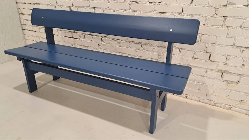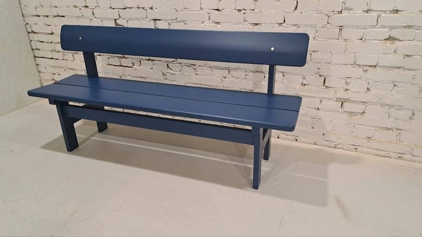 Bänk 1700 mm lång, helt i massiv ek, behandlad med blåpigmenterad olja.
