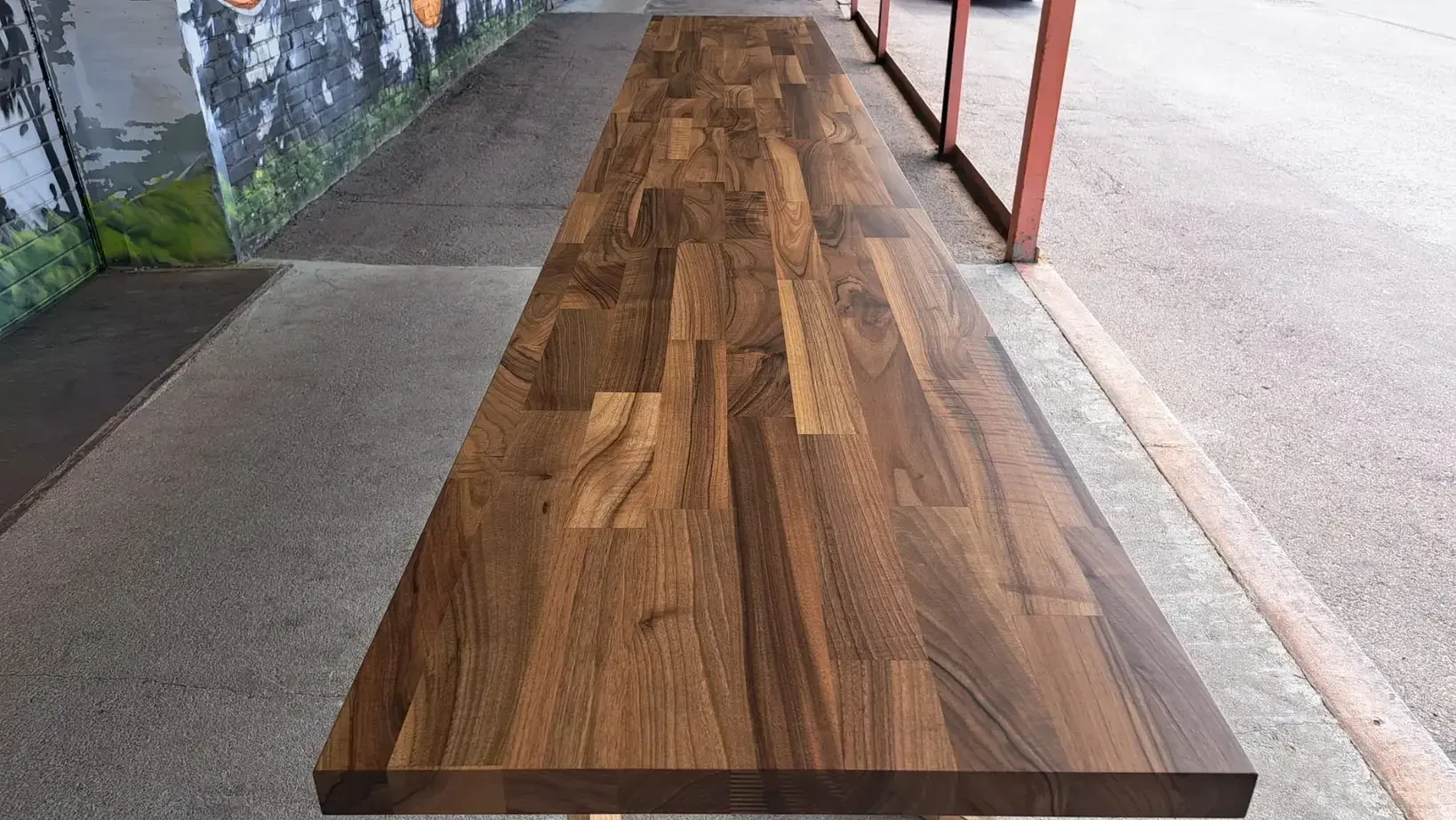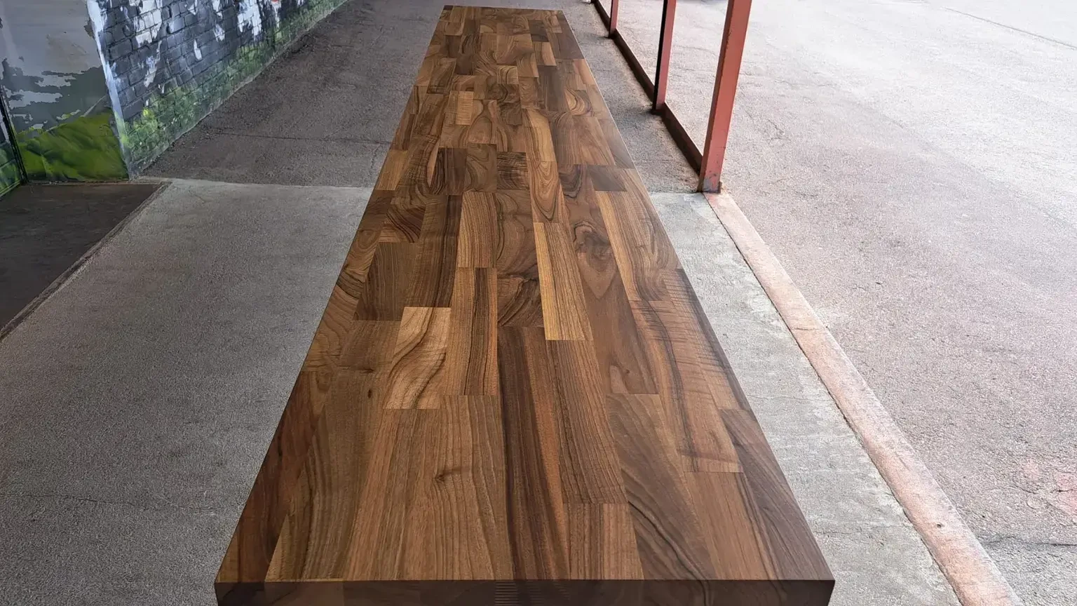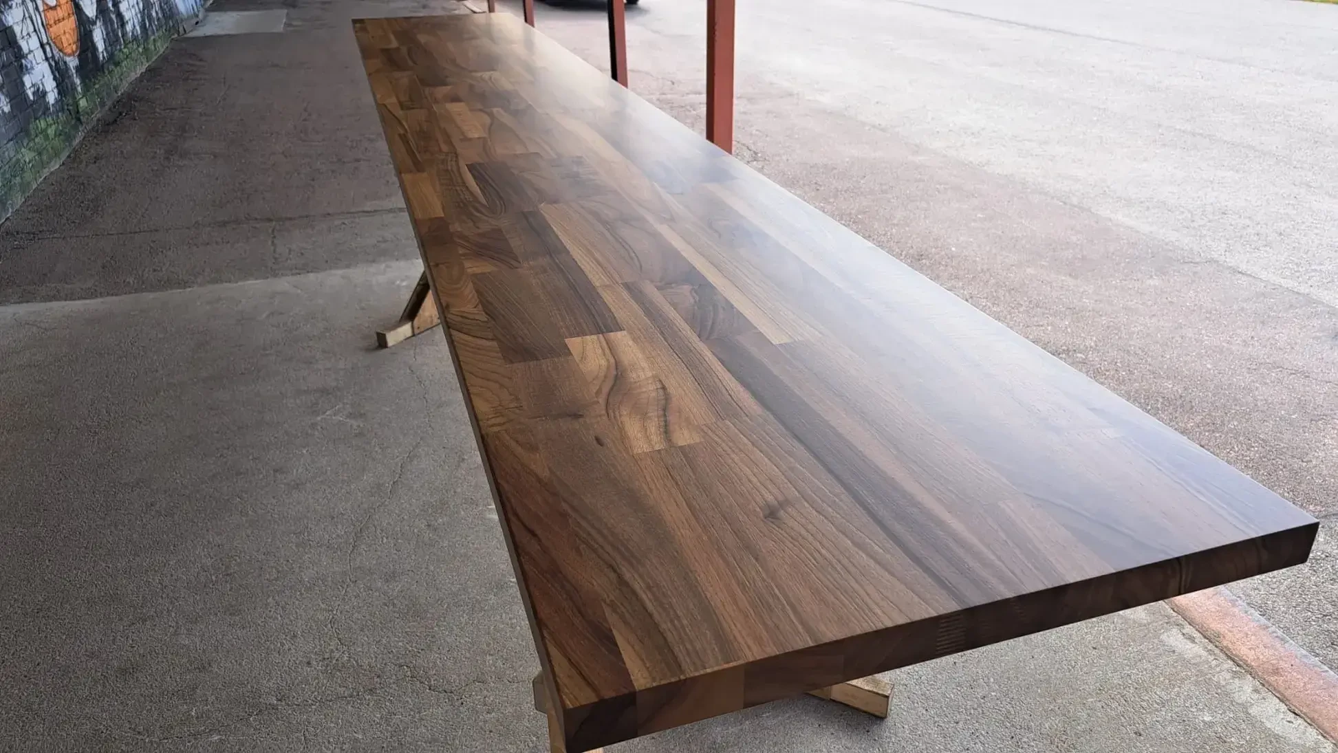 Bordsskiva i valnöt, storlek 630x3600 mm. Tjocklek 40 mm. Tillverkad av kantlimmad skiva, täckt med naturolja (Borma).